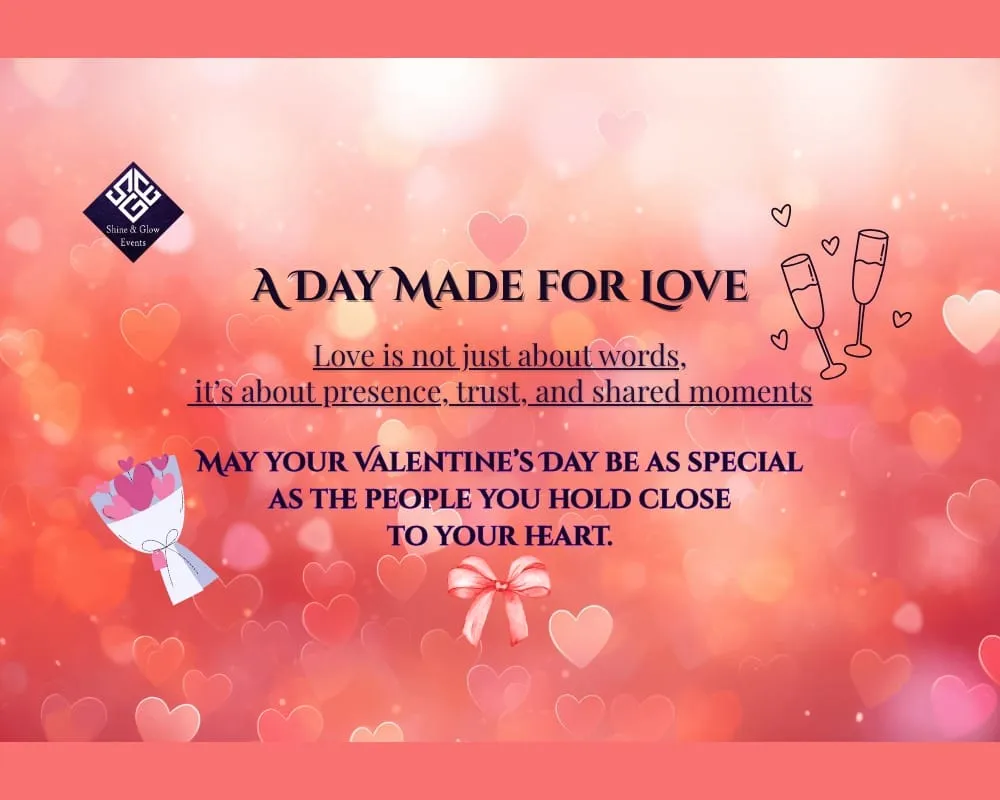 Valentine’s Day is more than just a date on the calendar. It is a celebration of love, emotions, togetherness, and meaningful connections. Every year on 14th February, hearts come closer, smiles become brighter, and love fills the air. On this special occasion, Shine & Glow Event Planners warmly wishes everyone a very Happy Valentine’s Day, […]