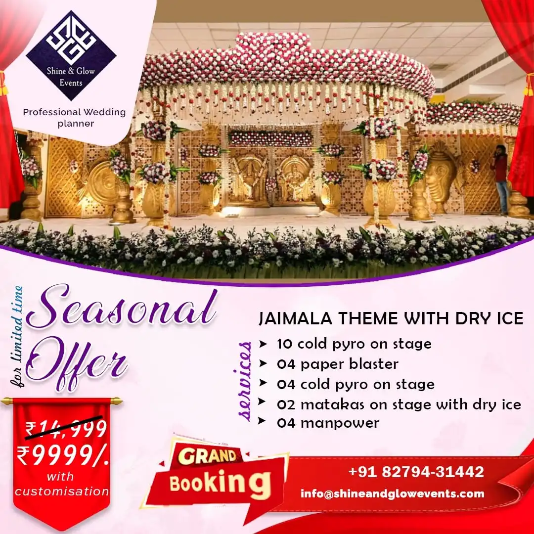 why not make it extraordinary? At Shine & Glow Events, we believe every couple deserves a cinematic entry and a breathtaking Jaimala moment. With our special seasonal offer, you can turn your stage into a mesmerizing, dream-like setup that feels straight out of a fairy tale without spending a fortune.